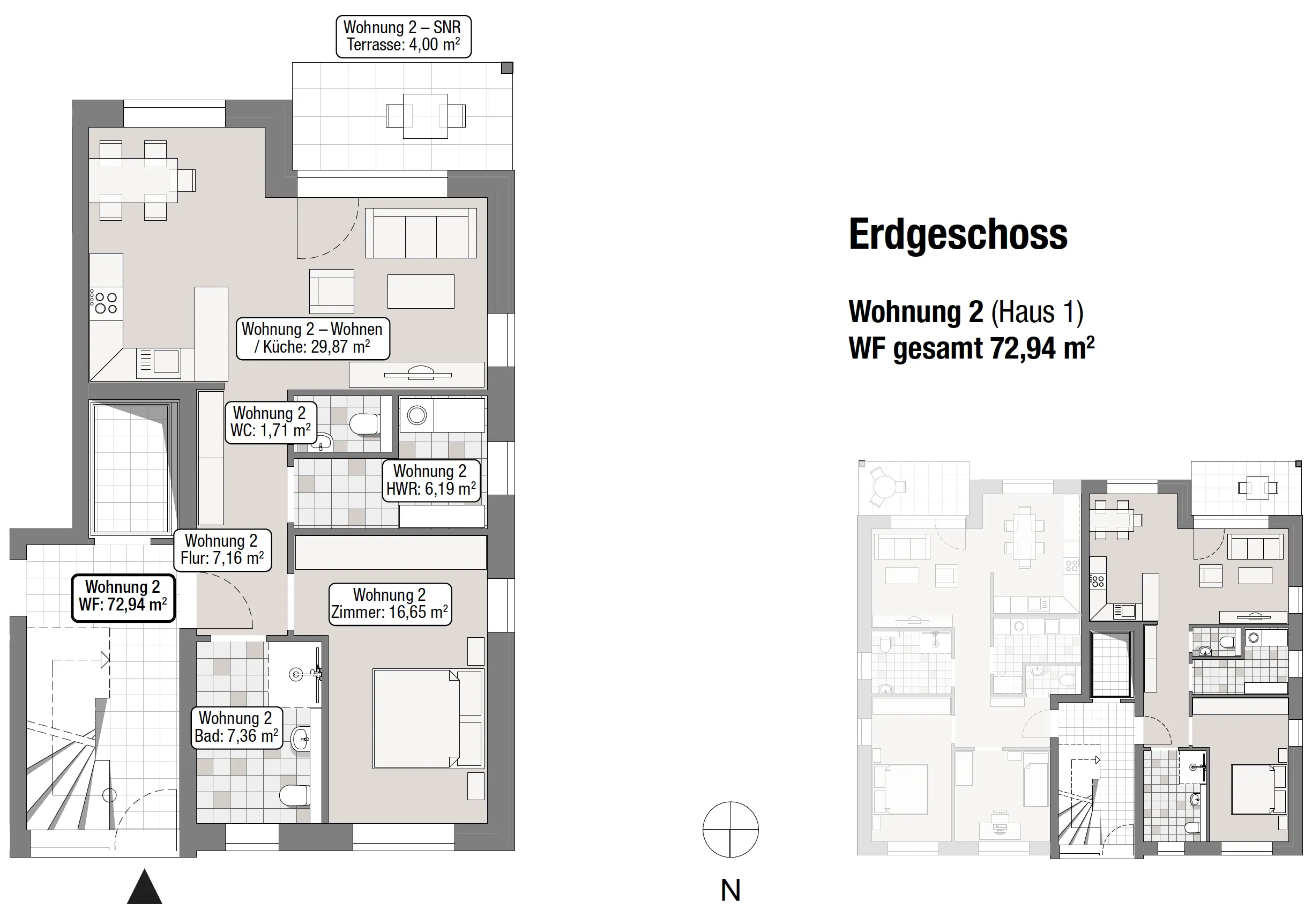 Wir behalten uns Änderungen vor, die wenn notwendig, kostenneutral umgesetzt werden. Alle Maße und Flächenangaben sind circa Maße. Die in den Zeichnungen dargestellten Einrichtungsgegenstände oder Möbel gehören nicht zum Lieferumfang. Bei der Ermittlung der Wohnfläche werden die Terrassen, Balkone, Loggien und Dachterrassen je zur Hälfte mit in die Gesamtwohnfläche einberechnet.